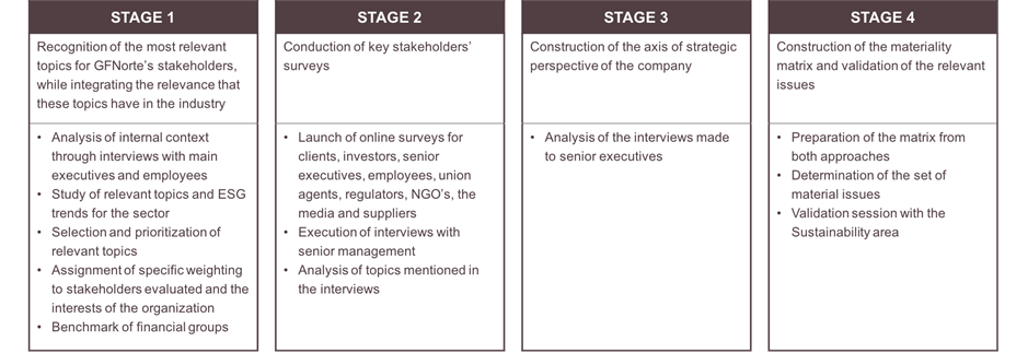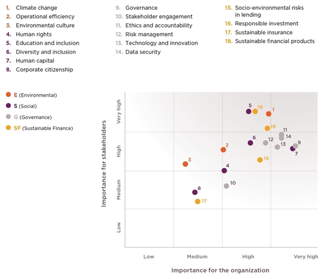 Materiality is an essential component for the definition of the sustainability strategy since it allows the detection of environmental, social and economic risks, which in turn triggers the alignment of the organization's strategy to the factors of greatest impact and interest; generate action plans and performance indicators and report and communicate progress in ESG based on the relevant topics that make up the matrix.
