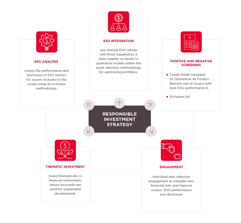 Likewise, within the product offering managed by Operadora de Fondos Banorte, we offer a relative management equity fund, whose investment strategy is generated through a quantitative model that, among other factors, uses ESG factors within a positive screening process.